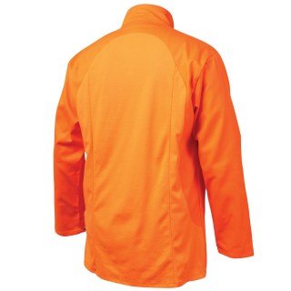 The JF1625-OR offers all the protection of our standard welding jacket, with the added comfort of a lightweight and breathable flame-resistant cotton stretch knit back panel. The looped knit yarns of the back panel offer just the right amount of horizontal “give” as a welder moves his shoulders and arms. And, these looped yarns allow more air to flow through the fabric, providing cooling breathability and comfort. Tested to maintain protection for light welding applications through 50 home washings.